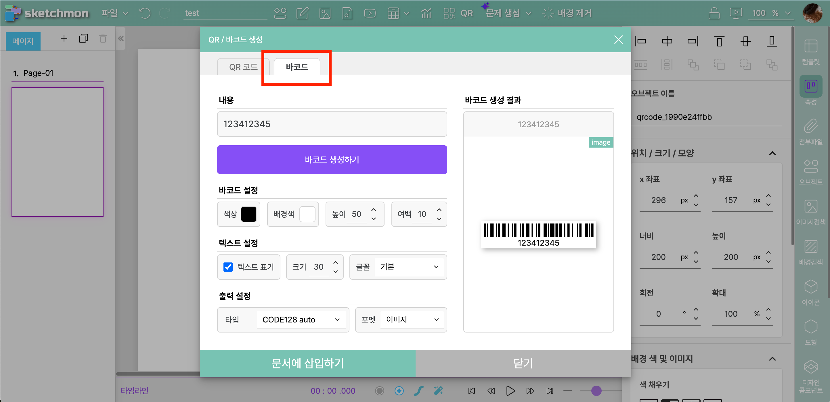 스케치몬에서 간편하게 큐알코드 및 바코드를 만들어서 콘텐츠에 삽입할 수 있습니다.