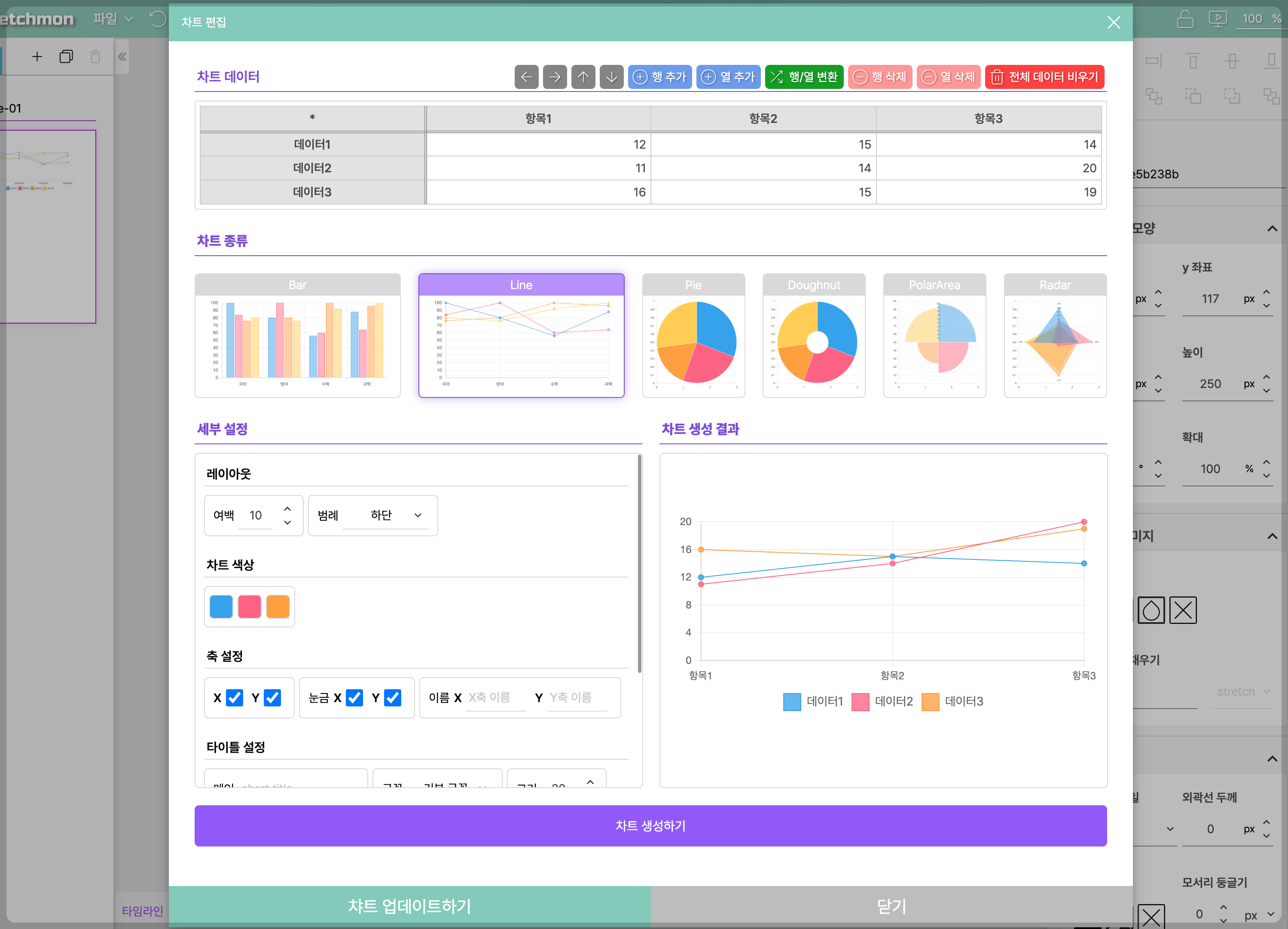 스케치몬에서 콘텐츠에 차트를 만들고 수정하는 방법에 대해 안내 합니다.