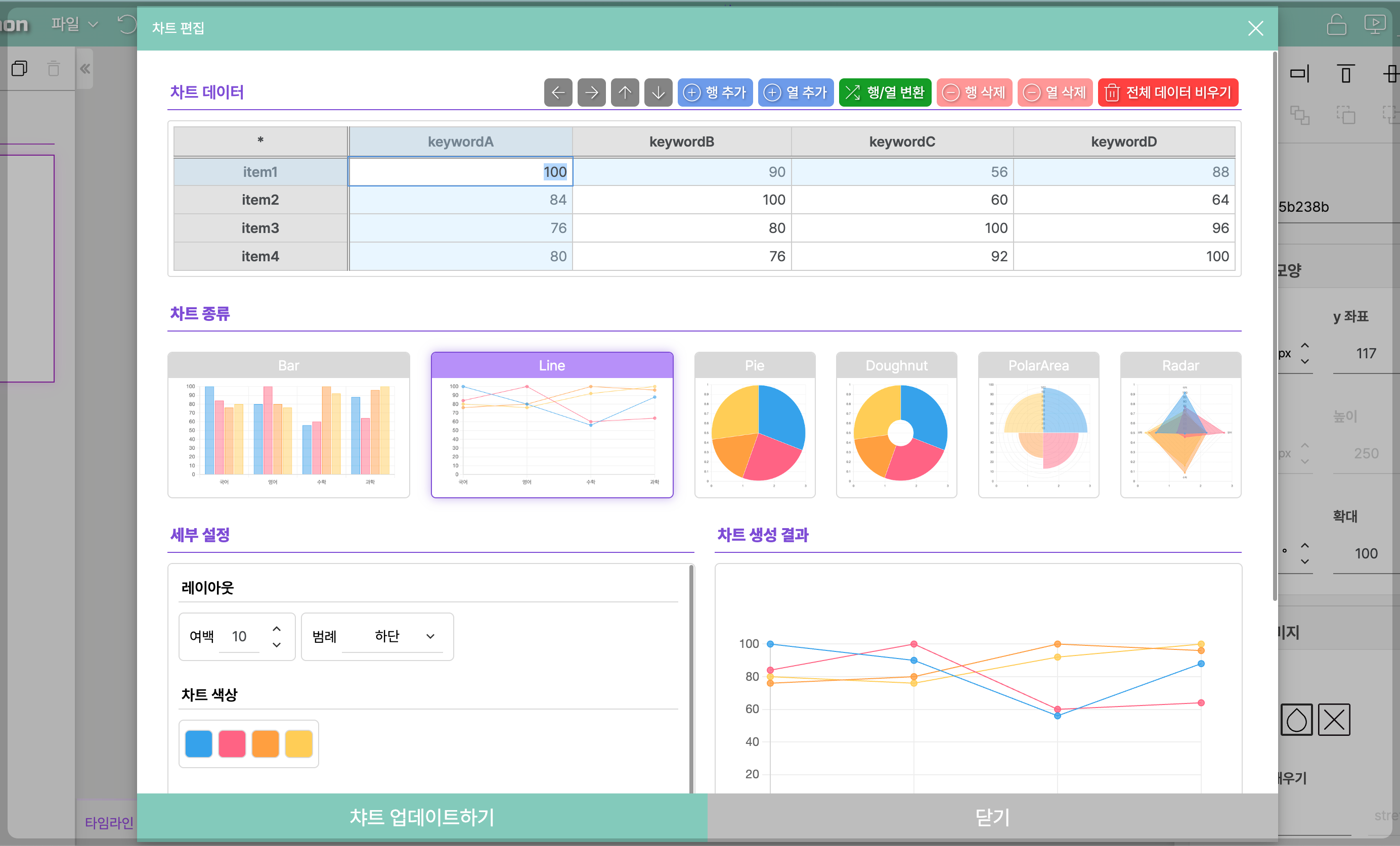 2. 상단의 차트데이터 부분을 원하는 데이터로 수정하고, 하단의 차트종류 및 세부설정을 수정한 뒤 제일 하단의 [차트 생성하기] 버튼을 클릭하면 차트 생성결과에 해당 차트가 미리 보여집니다.