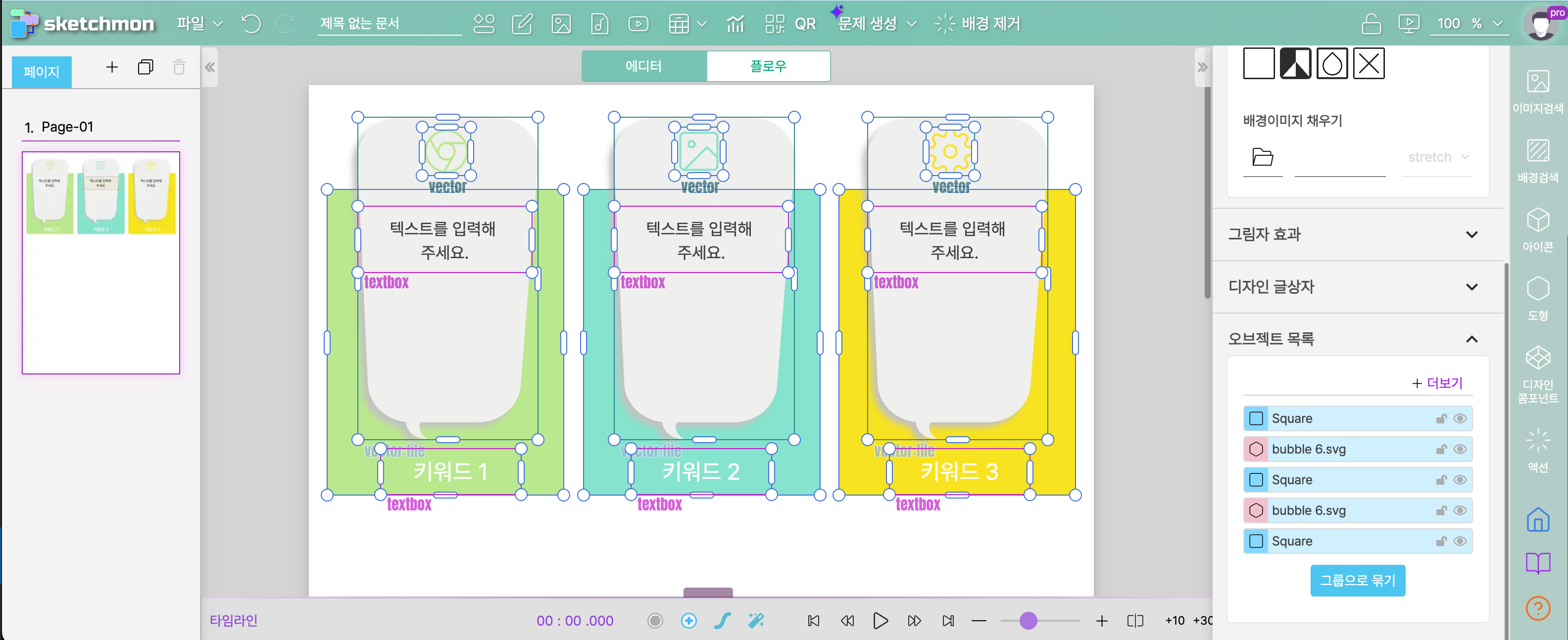 * 그룹이 해제된 경우 2개 이상의 오브젝트가 선택되면 위 그림과 같이 [그룹으로 묶기] 버튼이 활성화 됩니다.