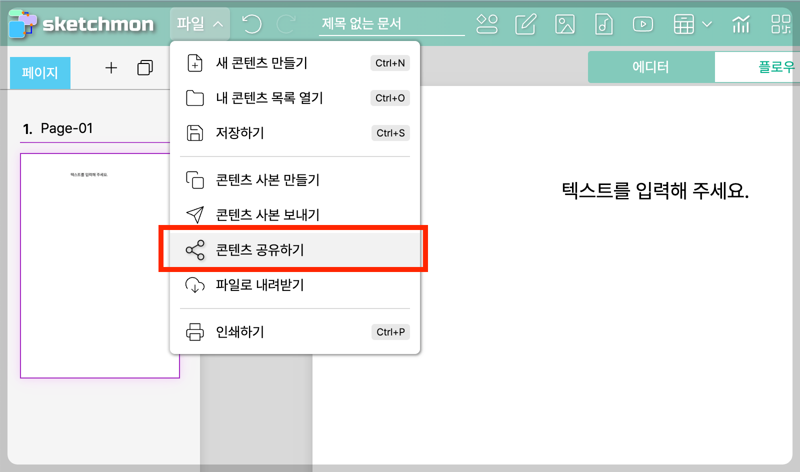 6. 결과물을 공유하려면 [파일] 메뉴에서 "콘텐츠 공유하기] 를 선택하여 공유URL 을 생성합니다.