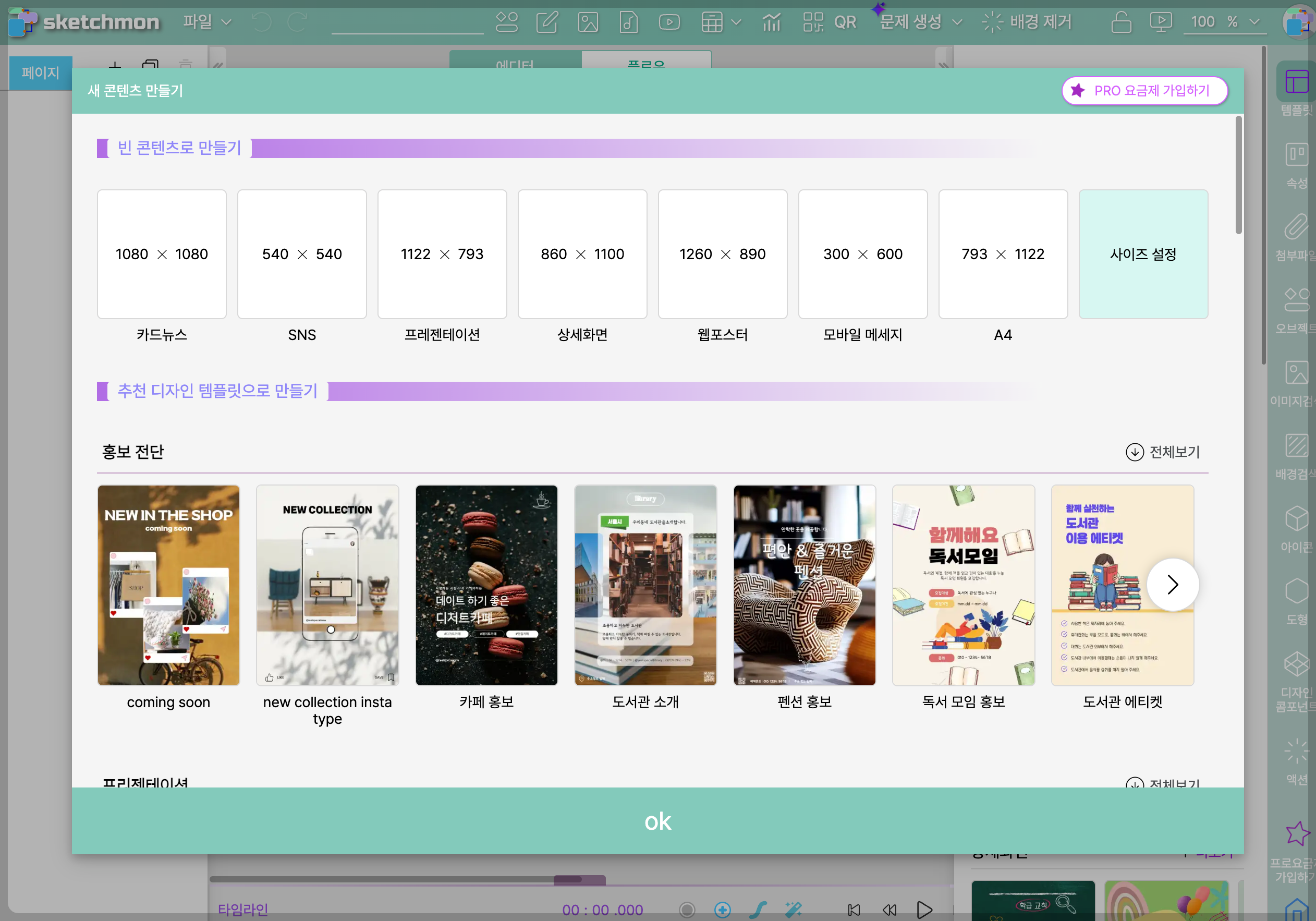 로그인을 완료하면 아래와 같은 [새 콘텐츠 만들기] 작성 화면이 뜨며, "빈 콘텐츠"나 적합한 "템플릿"을 선택하여 콘텐츠를 만들 수 있습니다.