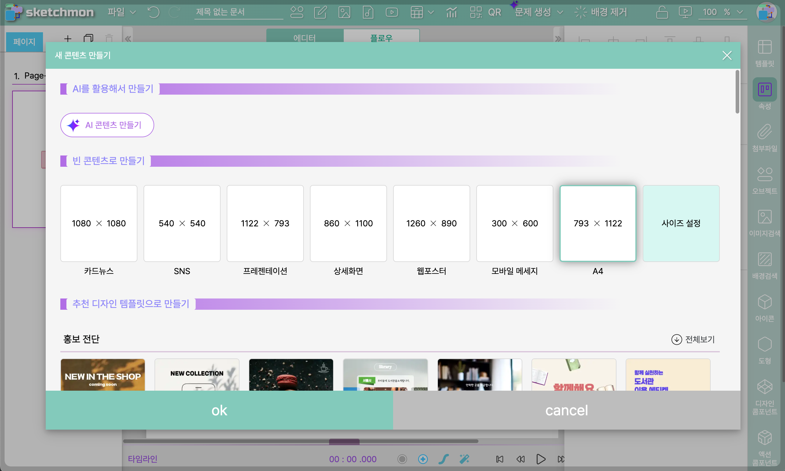 새 콘텐츠 만들기 팝업에서 [A4] 상자를 더블클릭 하거나, 한번 클릭 후 하단의 [ok] 버튼을 클릭 합니다.