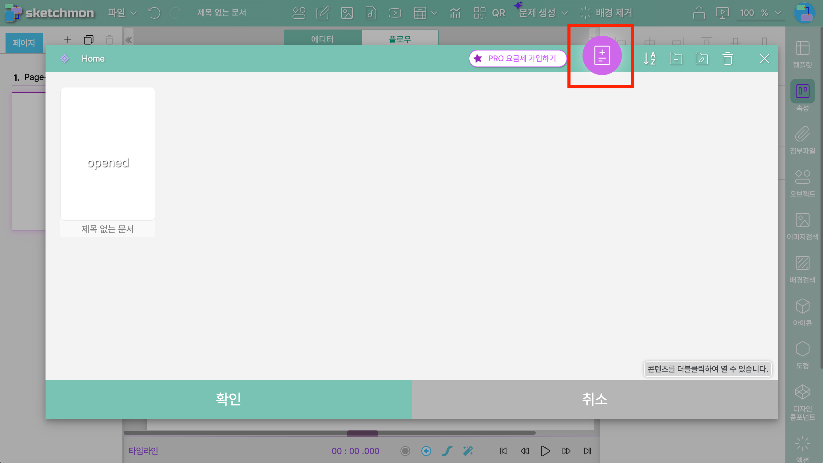 - 이전에 생성한 콘텐츠가 있는경우 : 스케치몬에 로그인 시 자동으로 내 콘텐츠 목록 창이 열립니다. 이 창 상단의 [새 콘텐츠 생성] 버튼을 클릭합니다.