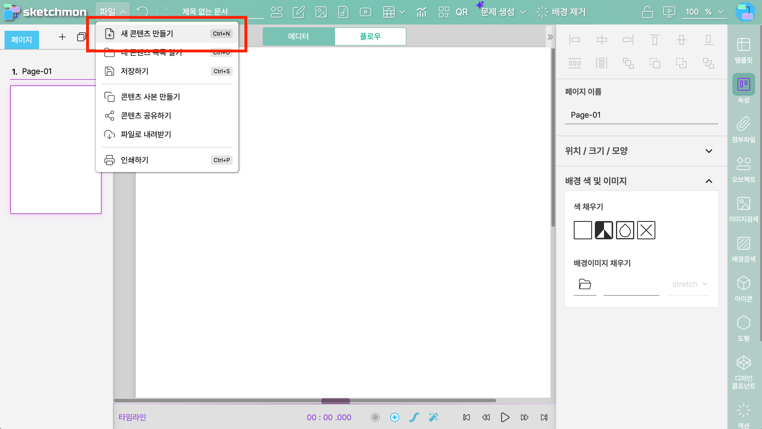 - 다른 콘텐츠가 이미 열려있는 경우 : 상단의 [파일] 메뉴를 클릭하고 하위 메뉴 중 [새 콘텐츠 만들기] 항목을 클릭합니다.