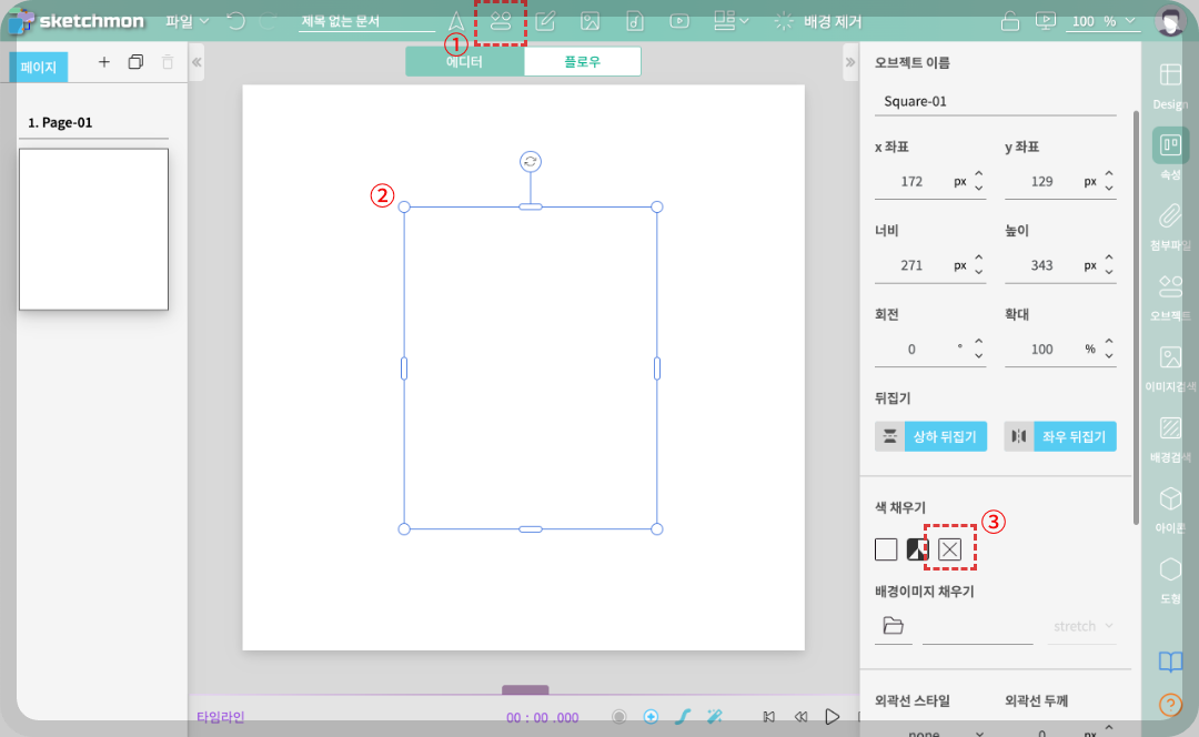 1. 화면에 사각 박스를 적당한 사이즈로 드래그 하여 그리고, 배경을 없애 투명하게 만듭니다.