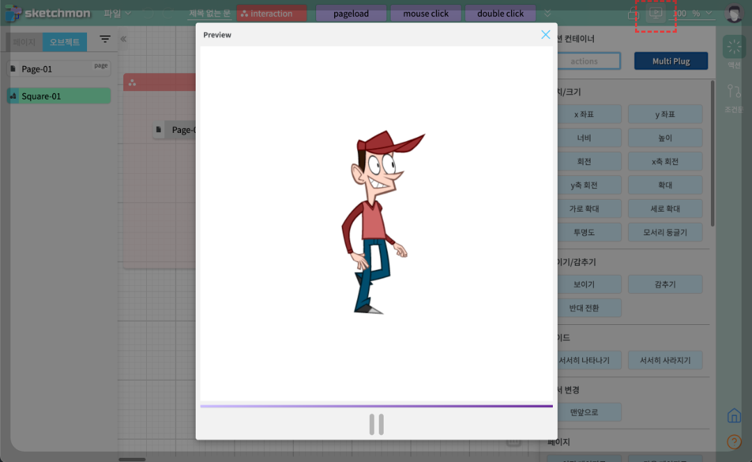 플로우 내용 : 페이지가 로드되면 위에서 만든 스프라이트 애니메이션을 재생합니다. (위에서 스프라이트 애니를 만든 사각박스 이름이 Square-01 입니다.)